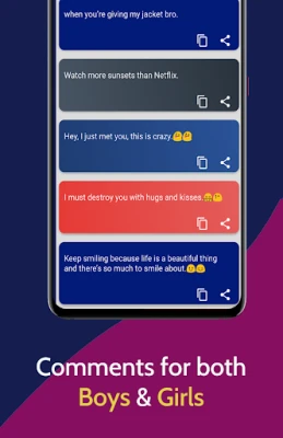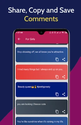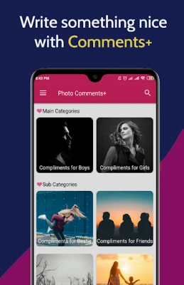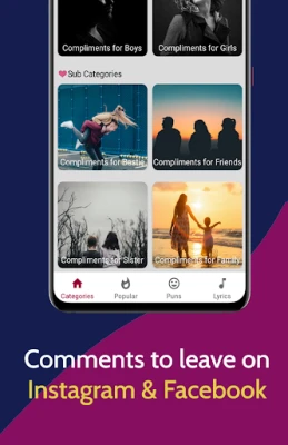 Have you ever got stuck writing nice comment on someone's photo or reply someone's comment. Worry no more ! CommentPlus app helps you to write best comments on social media photos. It consists of all sorts of comments ranging from cute, funny, sarcastic, love and other categories.