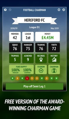 This free version is a full, completely playable game with a few of the non-essential "Pro" features disabled. Your chairman career lasts 30 seasons before you have to retire - can you make it to the top before that happens?