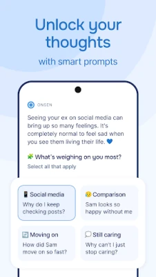 Onsen offers a judgment-free, stigma-free environment where you can explore your mental health and personal growth at your own pace. With private, secure interactions, you can trust that your journey with Onsen remains confidential and protected.